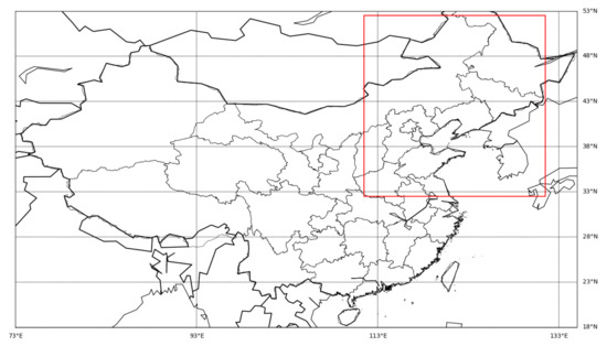 The geographic extent of the experimental area on the map (33° N–52° N, 112° E–131° E).