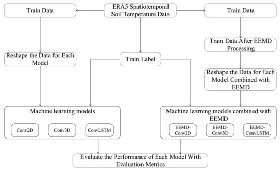 In this study, the original spatiotemporal data and the EEMD processed spatiotemporal data are used to train Conv2d, Conv3d and Conv-LSTM models to predict soil temperatures one day later, three days later and five days later. Persistent forecasting (PF) [37] is also involved in the comparison, which is a simple forecasting method that treats the first day’s temperature as the next day’s forecast. PF can be seen as a minimum criterion to assess the feasibility of DL methods. Experimental data will be split into two parts. The first part, including 80% data, is used for training models. The remaining 20% data are used as the testing set. The overall flow of the experiment is shown in Figure 3.