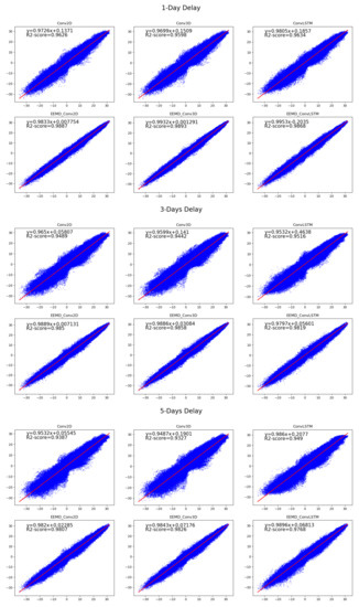 When the latency of the prediction increases, all models’ performance decreases. The most significant performance degradation among all models is PF, which already performs worse than the other DL models. In addition, among the DL models, the models that incorporate EEMD all perform better. Even the performance under 5-day delay outperformed the DL models without EEMD under 1-day delay. Figure 4 is scatter plots of the predicted and true values, which shows the degree of fit between the predicted and observed values of the DL model. As seen in the scatter plot, the DL model incorporating EEMD has a better fit. As the delay increases, the predicted values of the model with EEMD still fit well. With the help of EEMD, models are better able to overcome the decrease in accuracy of the prediction due to the increase in latency.