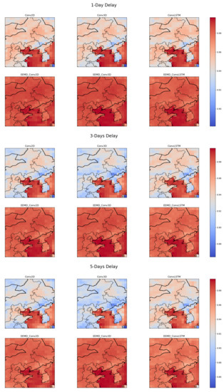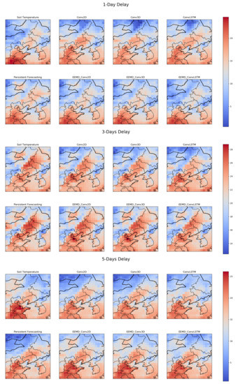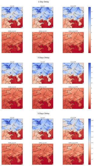 For three different delay cases, we randomly select the observation of a particular day to compare with the predicted results of each model. Figure 5 shows the spatial pattern of ST on a random day. The EEMD-based models have a high spatial similarity to the observations. The heat map and MSE heat map based on the observed and predicted values are shown in Figure 6 and Figure 7. It can be seen that the overall fit of the predicted values of each model decreases as the delay increases. However, for a particular delay, the model with EEMD has a better fit. Among the models combined with EEMD, the predicted values of EEMD-Conv3D have the best fit to the observed values.