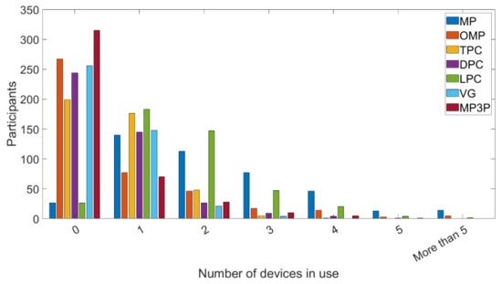 It can be seen that the most used electronic device was the MP, with 2.17 units per capita. This value was more than double the national average, which is 1.09 units per capita [26], indicating that some kind of electronic device concentration is happening in the most educated and wealthy strata of society. The fact that smartphones are the most used devices is in accordance with world trends, since their use is increasingly necessary in different tasks of everyday life. Other research has already shown that these devices are in fact the most popular ones currently [9,29].