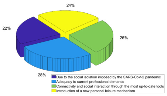 This fact indicates that the university population tends to be in a process of constant technological updates in order to keep up with the growing demand, such as new software requirements, in addition to the demand of using new hardware that requires more memory and processing capabilities [2]. This reason was also the most important reason for acquiring new devices among Chinese students [9]. The second and third reasons with greater significance were related to connectivity and interaction through more up-to-date tools and personal leisure, respectively. This fact shows the search for new technologies for personal use, and, just as in the case of the first reason, new devices tend to have new features and better specifications, leading to their acquisition. The reason that least influenced the research participants was the issue of social isolation imposed by the SARS-CoV-2 pandemic. Nevertheless, this reason had 22% of the votes, a representative one, showing that the responses were well-balanced and indicating that perhaps the pandemic may have increased the consumption habits of electronic equipment of the group in question. It is worth mentioning that the reasons “adequacy to current professional demands” and “connectivity and social interaction through updated tools”, which were somewhat related to equipment obsolescence, accounted for 54% of valid responses.