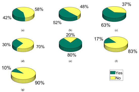 Results of general knowledge questions: (a) Do you have any knowledge about the National Solid Waste Policy (Federal Law No. 12,305 of 2010)?; (b) Have you heard of reverse logistics for electronic waste?; (c) Have you heard of circular economy?; (d) Have you heard of urban mining?; (e) Are you aware of the danger of any type of electronic waste?; (f) Are there collection points for this type of material in your place of residence?; and (g) Do you know any electronic waste collection company?