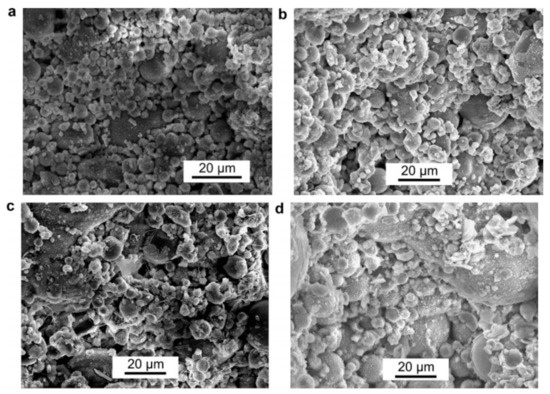 There has already been a revival of excitement in dynamic magnesia (MgO) cements with a high MgO component in recent decades, but most of the research was already published in the field of quality management or web outlets rather than peer-reviewed journals [24]. Whenever the responsive MgO is generated in a carbon-recycling cement kiln, the subsequent CO2 absorption (by the cement in operation) is taken into account. Based on a 2001 application, Harrison of the Australian company TecEco was granted a patent in the United States that explains the use of expanded curing periods and occasionally steam-curing to manufacture solid blocks made of MgO, pozzolan, and PC [25,26]. The MgO used is made by calcining MgCO3 at a low temperature of 800 °C; this causes layer strain and permeability in MgO samples that would otherwise be coated at higher temperatures. This allows for the precise regulation of MgO reactivity based on treatment conditions and particle shape, ensuring that it hydrates at the same period as the other cementitious materials [25]. Pertinently, this MgO responds much faster than kilned MgO (low-reactivity MgO calcined at >1500 °C), including the free MgO in Portland (clinker), which has been fired, often at extreme temps, and thus normally hydrate slowly, causing cracking within traditional cements as an expansive reaction rate is caused centrally within a hardened substrate [26]. MgO has little impact on the formation of PC hydrate processes after up to four weeks of hydration [27,28,29]. Many tests have shown that some responsive MgO–PC-blended cements do not absorb a detectable amount of CO2 from the atmosphere within the period of curing and are hence impossible to be carbon-negative, or even carbon-neutral, in the appropriately limited period. Once MgO is applied to a PC-based device, Cwirzen and Habermehl-Cwirzen [25] found that now the freeze-thaw tolerance, flexural and compressive strengths are decreased due to higher capillary permeability. Figure 2 shows low magnification scanning electron micrographs of fractured surfaces of all types of samples at 14 days.