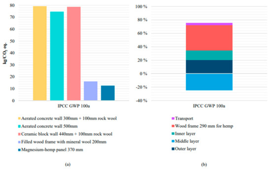 (a) Comparison of different wall types and their greenhouse grass emissions; (b) emissions by percentage of hemp-magnesium panel parts. Reprinted with permission from Ref. [61]. Copyright 2018 Elsevier.