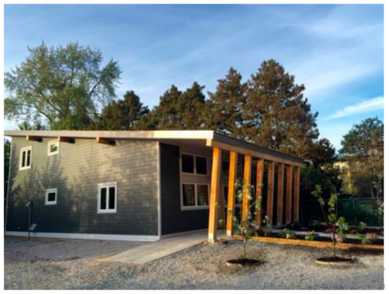 A recent study conducted by Li et al. [60] investigated a life cycle assessment (LCA) of an innovative and sustainable magnesium oxide structural insulated sandwich panel (MgO SIP) used for a high-performance smart home in Vancouver. For those purposes, the authors constructed a prototype house (Figure 5) and compared the environmental impacts across six parameters for the MgO SIPs, traditional SIPs, and traditional stick-frame construction across the life cycle phases of raw material extraction, manufacturing, transportation, construction, and operation. The findings of this study indicated that the MgO SIPs do not outperform conventional alternatives, notably because of the long-distance transportation of materials. However, further LCA of hypothetical scenarios shows that MgO SIPs have a great potential to become more environmentally friendly than the conventional alternatives by sourcing MgO domestically, implementing onsite manufacturing, and eliminating oriented strand boards.