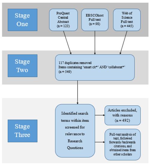 We followed the PRISMA process [12] for database searching, commencing with searches of the Web of Science (Core Collection), ProQuest Central, and EBSCOhost (Academic Search Premier) databases. The search was limited to peer-reviewed items published in English from 1999 to 2020, as Meijer and Bolívar [6] report the first smart city governance item they found was published in 1999. The terms ‘smart cit*’ AND ‘collaborat*’ were applied. We did not apply synonyms, as our research was tightly focused upon the use of the term collaboration.