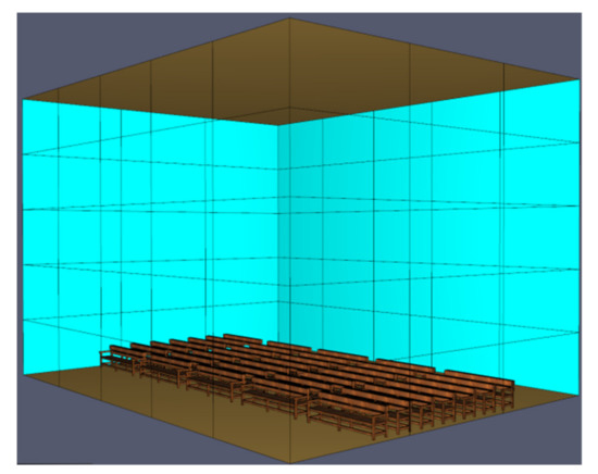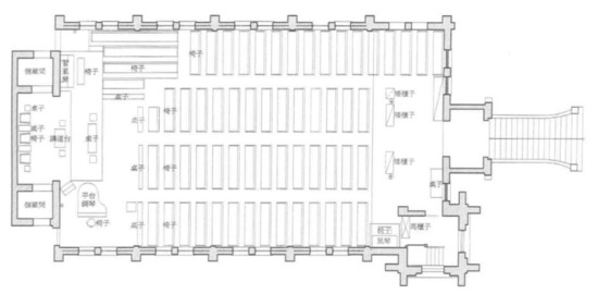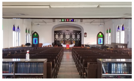 The object of simulation is the “Tamsui Church” (Figure 1), which has a wooden ceiling in the interior space (Figure 2). The simulation is mainly focused on estimating the scale of a fire of the wooden seats in the Church (Figure 3 plan view). Through FDS, the possible fire scale, heat release rate, ignition loss and fire spread when the wooden seats in the Church are on fire can be understood, such that improvement measures can be proposed. The burning of a single wooden seat will be investigated first, and then the simulation of larger burning area will be carried out to discuss the possibility of extended burning and the scale of the maximum heat release rate. In general, the size of the fire source in the existing FDS fire simulations is fixed with no ignition loss. The reason for employing such a setting is that (1) this is a more conservative way of carrying out the evaluation; however, the result needs to be improved by adding equipment with higher specifications, and (2) the ignition loss setting is more complicated, making it difficult to carry out the calculation with normal computers and obtain a result. Based on the fact that it is not easy to add excessive firefighting equipment into historical buildings, the effect of controlling the number of users and the amount of furniture (fire load) is limited. Therefore, the greatest value of this study lies in (1) using parallel computing to overcome the computational challenge, (2) understanding the fire source (wood material) ignition loss and whether the fire spreads through settings, in order to analyze the maximum heat release rate and the scale of the fire, and (3) formulating the most appropriate improvement plans of use restrictions or hardware protection for historical buildings.