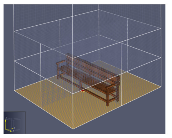 The individual bench was graphed based on its actual size on the site. The maximum heat release rate of ignition source burnout was set. Existing data were compared and used as the basic information for determining the heat release rate of the bench. The basic prerequisites and conditions for simulation are shown in Table 1. The individual-bench FDS simulation model is illustrated in Figure 4, and the positions of the measuring points are shown in Figure 5 and Figure 6.