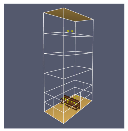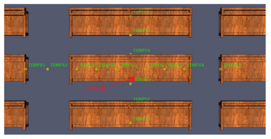 Multiple benches and the intervals between them have been graphed based on their actual state on the site. This simulation focused on the analysis of the possibility of fire spreading from the benches and the magnitude of fire, as well as the measurement of the maximum heat release rate, thereby proposing a limit for the use of the building and measures for improvement. The prerequisites and conditions for the simulation are shown in Table 1. The multiple-bench FDS simulation model is illustrated in Figure 7, and the positions of measuring points are shown in Figure 8 and Figure 9.