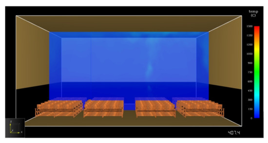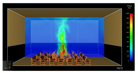 The simulation result for a single seat shows that under the constraint of such space conditions (the height is only 6 m), even if a single seat burns, it will cause the ceiling to reach the ignition temperature of wood, which only takes about 6.21 min to burn. Therefore, fire detection equipment is very important in the initial stage of fire to provide the required early warning. It is also noted that the highest temperature occurred at 7.74 min, indicating that the fire grew extremely fast. For this reason, adding the appropriate active fire-extinguishing equipment for the initial stage of the fire would be necessary to delay the spread of the fire, allowing firefighters to have enough time to put out the fire and carry out the rescue (the time for firefighters in Taiwan to arrive at the scene and being to carry out rescues is approximately 6 to 8 min after the report).