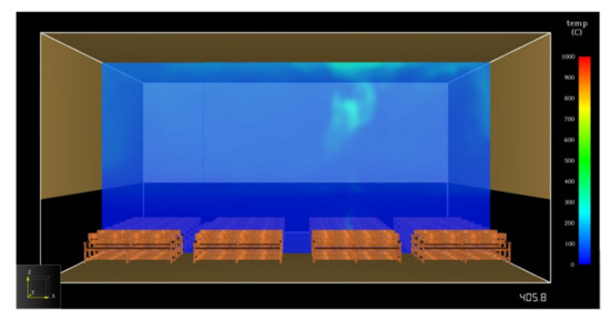 The highest temperatures over the four measuring points at a height of 6.0 m on the ceiling all exceeded the ignition temperature for wood (260 °C). The times taken were as follows: Measuring Point #2 (402.88 s), Measuring Point #3 (405.85 s), Measuring Point #1 (406.02 s) and Measuring Point #4 (407.46 s). This shows that the ceiling was about to ignite and burn. The time taken and the highest measured temperatures are shown in Table 3. In addition, the temperatures over benches ahead of and behind, as well as on the left and right of, the ignited benches also reached the ignition temperature for wood (260 °C). The times taken for benches positioned at the front, back, left and right to reach 260 °C were about 478.97 s, 488.10 s, 680.00 s and 687.53 s, respectively (the times taken for the fire to spread towards the benches on the left/right were longer because this was the longer side of the bench). The heat radiation level shows that the time required for the heat radiation to reach 10 kW/m2 (necessary for wood ignition) was even shorter in this simulation, as the benches were very close to each other. It was also proven that if the wooden benches were on fire, under their current spatial arrangement, an extensive fire scenario seemed almost unavoidable, and it only took five minutes for the fire to spread around. Therefore, appropriate adjustments of monitoring devices and firefighting equipment for early-stage fires are imperative. Other relevant data are summarized in Table 4, and detailed section views of the bench temperatures are illustrated in Figure 10, Figure 11 and Figure 12.