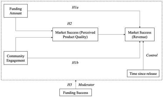 We additionally introduce whether the funding was successful or not as a moderator. There are many examples of games that were released on the market although funding on the crowdfunding platform was not successful, for example, “Galactic Game”. Although the founders asked to raise money with a goal of USD 45.000, only USD 6.607 were pledged and the project failed to get any funds on Kickstarter. Yet, the game was later released and had a pretty high rating of 88 out of 100 on the Metascore platform, which is predominantly used to evaluate creative projects including video games. These products could still have benefited from the funding with regard to their budgeting and thus success and quality, especially with the funding amount acting as a signal to other potential investors [37] but not directly and thus differently, in case the funding through the platform succeeded. Similarly, while the ideas and community engagement would also have an effect on success, this might also materialize to a different degree, for example, because the project founders took the feedback as less important after the funding failed, or on the other hand, adjusted their plans to a larger extent after failing. In that way, failed funding is actually also perceived as a market signal to the entrepreneur, who will adjust plans and behavior accordingly. We, therefore, propose the following hypothesis: