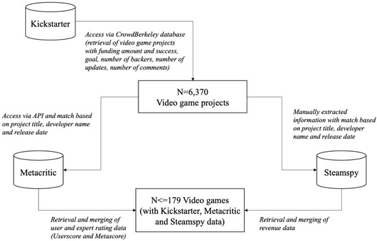The starting point was video game projects on Kickstarter. The Kickstarter data were extracted with the tools provided by the CrowdBerkeley initiative. The CrowdBerkeley database provides scrapped data from leading crowdfunding platforms with specific schema and variables [54].