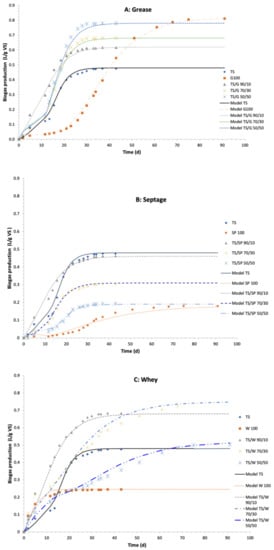 Cumulated biogas production for different mixtures in BMP assays. (A) Grease; (B) Septage; (C) Whey. TS: Thickened sludge; G: grease; SP: septage; W: whey. The numbers represent the mixture ratio in their respective percentages. Lines correspond to modeling using Equations (1) or (2).