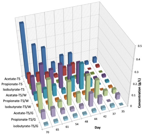 The ratios expressed in COD between the substrate and the co-substrate were nominally fixed in VS at 80/20 for the TS/W mixture and 60/40 for the TS/G mixture.