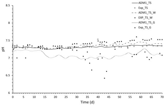 Comparison for pH evolution between experiments (dots) and modeling (lines). TS: thickened sludge; TS_W: thickened sludge/whey; TS_G: thickened sludge/grease.