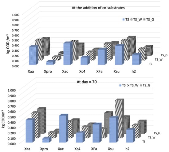 The microbial degrader population distribution obtained from the simulation shows that on each day corresponding to the addition of co-substrates, profiles were similar between the three reactors (Figure 5). On day 70, at the end of the simulation period for both experiment and simulation, the profiles were different. The main differences were observed for long-chain fatty acid degraders, sugar degraders and acetic acid degraders.