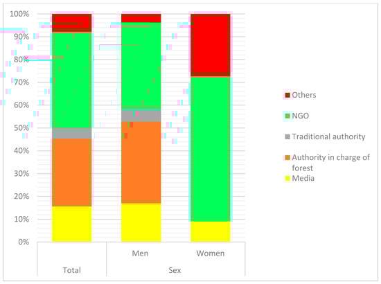 p < 0.05]; a significant number of women tended to rely mainly on NGOs (64%), while men had access to information through more diverse sources. For instance, while up to 36% and 6% of men refer respectively to the authority in charge of forest and the traditional authority as their main sources of information about the law, no woman referred to any of these two. The high number of women citing NGOs as their main sources of information may be related to the fact that most of these NGOs try to design inclusive programs and ensure that women and other marginalized groups are sensitized.