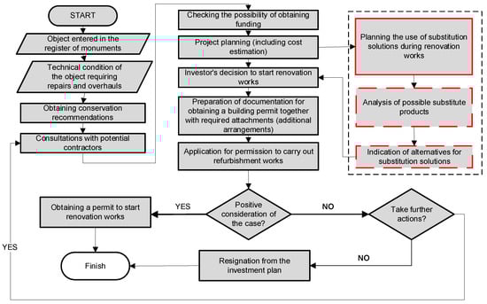 The use of building product substitutes in this type of building is challenging, not only because of the difficulty of selecting a suitable substitute due to need of meeting the procedural requirements approved by the conservator. Hence, many factors and conditions of different natures influence the selection of the best substitute under the given conditions, bearing in mind the consequences in terms of durability, strength, etc., during the further use of the building. During planning of construction works in a historic building, variant solutions that take into account the use of substitute materials are worth analyzing (if the conservator allows such solutions) (Figure 1).