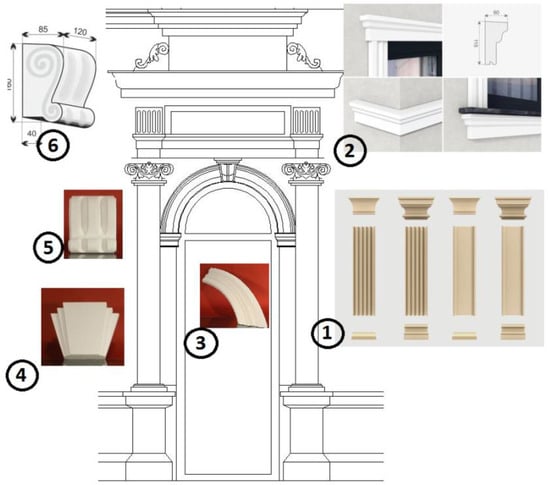 Examples of substitutes of building products used in refurbishment of elevations of historic buildings (1. pilasters, 2. cornices, 3. arch, 4. keystones, 5. and 6. brackets), drawings own elaboration, photos from internet resources [,,].