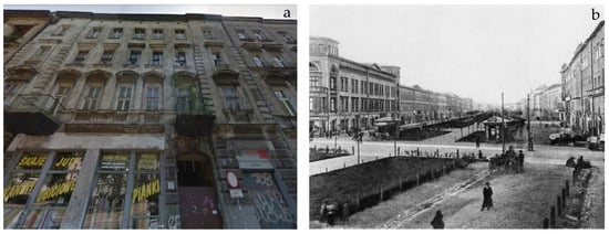 The building is located in the city center in the Kazimierz district Figure 3a; it was built in 1878. There is not much information available in the national archives about the first years of its use; we only know that it was a tenement house serving as a dwelling house. Few photographs were found showing the whole street where the building is located (Figure 3b).