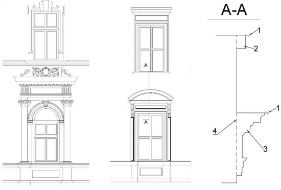 Architectural details of the renovated façade: 1. windowsill; 2. above-window stucco; 3. below-window stucco; and 4. building wall.
