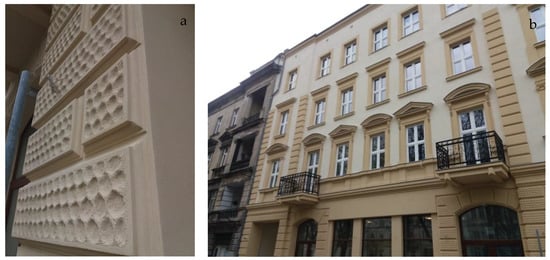 (a) Fragment of reconstructed rustication on the facade 29 April 2021; (b) tenement house after refurbishment 29 April 2021, authors’ archive.