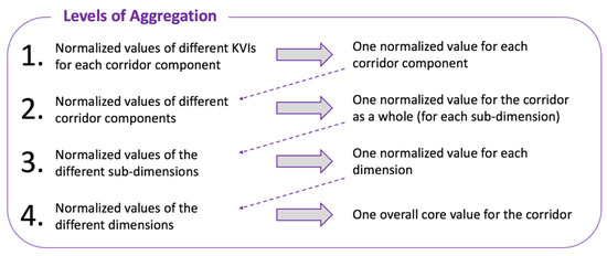 Four levels of aggregation, in a bottom-up approach, are distinguished for estimating the core value of a port-hinterland corridor (Figure 14). More specifically, once KVI values are determined, which may be either quantitative or qualitative, a normalization process should be undertaken so that a common basis is established, and the aggregation process is facilitated.