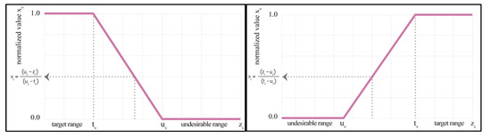 Different normalization methods are available, with “ranking”, “distance to target”, “Z-score” and “min-max” methods accounting for the widest applicability in the construction of composite indicators [29]. Each method presents its own advantages and disadvantages and/or limitations, which should be carefully considered before making the final selection [30]. In this context, and considering also the proposed aggregation method to be discussed below, the “min-max” normalization method is regarded as the most appropriate, although with a slight modification that is quite similar to the one adopted in [31]. More specifically, through this technique, KVI values are rescaled by linear interpolation into the 0–1 range, based on a minimum and a maximum value (Figure 15). These values are, however, not extracted by a specific dataset as is normally the case but, instead, represent (a) targets set in relevant policies (e.g., TEN-T policy), and (b) best-practice operational thresholds. To this end, the method’s key disadvantage (i.e., non-representative min-max range, due to outliers) can be overcome.