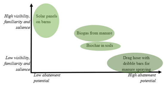 Conceptual model of the relationship between climate abatement potential and the visibility and salience of relevant climate measures in agriculture.