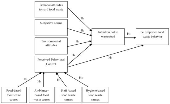 Ajzen [] explains that personal attitudes toward behavior are used to evaluate the behavior that further turns into the intentions to perform certain behavior. Accordingly, a positive attitude creates a stronger intention to behave in a certain way, while a negative attitude creates a stronger intention not to behave in a certain way. Based on numerous studies, it has been proved that consumers have a negative attitude toward food waste; i.e., they feel bad and conscience-stricken if they waste food [,,,], and they show concern if they have wasted food []. The positive effect of personal attitudes toward food waste has also been proved in other reports [,]. Moreover, the intention to waste food is also influenced by the norms and attitudes of other people, so-called subjective norms. Subjective norms imply the perceived social pressure to perform certain behavior []. In some studies which dealt with food waste in households, it was proved that subjective norms have no or quite insignificant impact on the intention to waste food [,], while others proved that there is a significant positive impact of personal standards on the intention not to waste food [,,]. The reason for adding into the TPB the final antecedent of intention, perceived behavioral control, was to extend the applicability of the theory to behaviors which cannot be always classified as based completely on one′s will. This construct refers to past experience as well as to potential barriers or facilitators of the behavior and represents the perceived ease or difficulty of behaving in a certain way. It contributes to stronger intentions and in case of reduced volitional control, it adds to the prediction of behavior []. Previous studies proved that in the case of food waste behavior, supposed behavioral control has a significant positive influence on the intention not to waste food [,,], and a negative impact on food waste behavior [,,,]. According to [], intentional process (motivation or willingness to act) is what drives behavior. Previous studies also found that a higher intention to avoid or decrease food waste undesirably impacts food waste behavior [,,,,]. Moreover, ref. [] suggests that TPB contains other constructs beyond the base model. The extended TPB models were applied in several studies aimed at investigating the factors which affect food waste in households or restaurants. This paper aimed to shed more light on the restaurants′ consumer food waste behavior by conducting an extended TPB, which involved environmental attitudes and restaurant food waste causes (food-based, ambiance-based, staff-based and hygiene-based) as additional predictors.