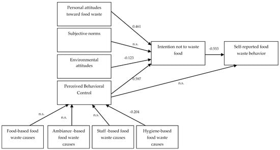 The aim of the research was to apply the extended TPB model by including two constructs of environmental attitudes and food waste causes (e.g., food-based, ambiance-based, staff-based and hygiene-based), in order to investigate their impact on consumers′ behavior in the context of food waste. The authors started with the supposition that individual norms, subjective attitudes toward food waste and perceived behavioral control would forecast intention not to waste food. Based on []’s TPB model, it was supposed that the intention not to waste food and perceived behavioral control also predict food waste behavior. Additionally, it was supposed that environmental attitudes and food waste causes, divided into four key factors for the experience of the products and services in a restaurant—food, ambience, staff and hygiene—could have an impact on food waste behavior through intentions and PBC. These constructs were added with the supposition that they would improve the predictive capability of the TPB model. The previous studies proved that subjective norms are not connected with the intention not to waste food [,,], or that their impact is very weak [,]. The impact of personal norms on the intention not to waste food has not been proved in this research either.