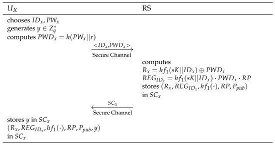 registers to using and . Firstly, chooses a and computes . Thereafter, sends to . After receives the message, computes and . After that, stores in . Thereafter, issues to , and stores y in . Subsequently, is stored in . The registration phase is performed via a secure channel. Figure 2 shows the registration phase of Rajaram et al. scheme.