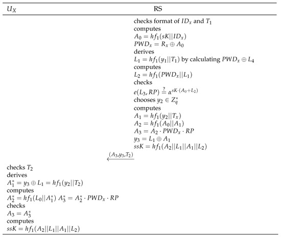 After receiving the message from , verifies the validity of and checks whether , where is a timestamp when received the message and is a tolerance. Thereafter, computes , , and . Subsequently, checks whether . If they are equal, chooses and computes , , , , and session key . Then, sends to . After receives the message, checks whether and computes , , and . If , computes session key . Figure 4 shows the authentication phase of Rajaram et al. scheme.