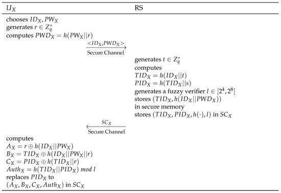 Before the authentication, registers to . chooses and , and generates . computes , and then sends to . checks whether is already registered after receiving the message. If not, chooses , and computes and . Thereafter, stores in secure memory. generates a fuzzy extractor and stores in smart card . transmits to . Subsequently, computes , , , and l. replaces to in . The proposed user registration phase is shown in Figure 5.