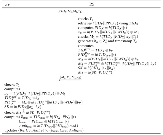 After the authentication phase, generates a new password and a random number , computes , and sends a password change request message to including . Thereafter, updates to and the password update is completed.