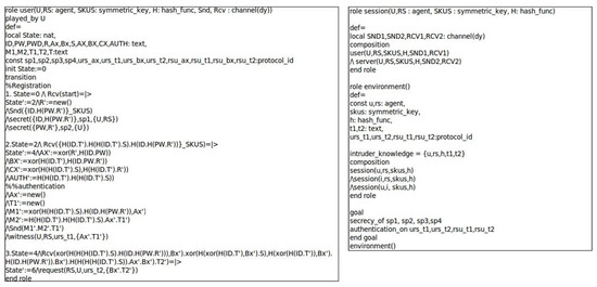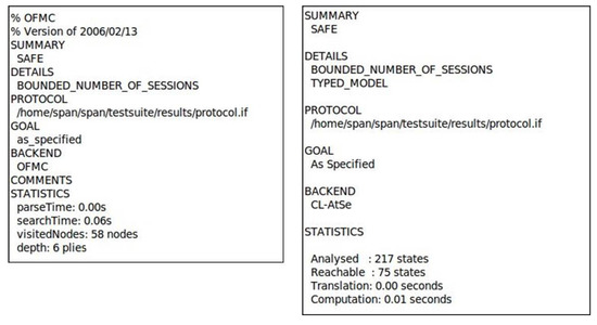 The AVISPA tool [43] can verify that the authentication protocol is secure against replay and MITM attacks by simulating the implementation of the authentication protocol as code. AVISPA is used in many authentication protocols as a formal verification tool [44,45,46]. It is implemented using the “High-Level Protocol specification Language” (HLPSL) and uses four back-ends: “On-the-fly Model-Checker (OFMC)”, “SAT-based Model-Checker (SATMC)”, “Constraint Logic Based Attack Searcher (CL-AtSe)”, and “Tree Automata based on Automatic Approximations for the Analysis of Security Protocols (TA4SP)”. The HLPSL2IF translator converts the intermediate format (IF) of the code implemented using HLPSL into the output format (OF). The OF shows the simulation results which include “SUMMARY”, “DETAILS”, “PROTOCOL”, “GOAL”, “BACKEND”, and “STATISTICS”. The SUMMARY shows whether the protocol is safe, the BACKEND gives the name of the back-ends, and STATISTICS shows the time of the trace of the attack. The left side of Figure 8 represents the role of user implemented in AVISPA tool. The remote server is implemented similar to the user. Furthermore, the right side of Figure 8 shows the session, environments, and goals of the proposed protocol.