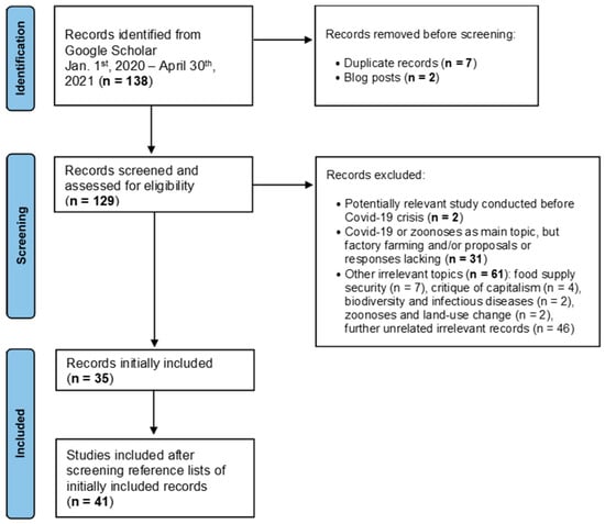 Each record retrieved by the search for the core literature was read completely to be checked for relevant content. The criteria for selection required a relevant article to contain (1) a relation between factory farming and zoonotic risk; (2) at least one recommendation, proposal, advice, suggestion, (call for) action, measure, policy or description of behaviours, attitudes or beliefs regarding or affecting this risk; (3) an explicit link in the article to the COVID-19 crisis that displayed those proposals, actions, measures, attitudes, etc., as responses to COVID-19. Blog posts that usually overtly express personal opinions and are not intended for (peer) reviewed publication were excluded from further analysis irrespective of their content; however, pre-prints, theses, grey literature, etc., were retained in accordance with the exploratory nature of this study (see above). Duplicate entries and articles with irrelevant content were removed in the next selection step (Figure 1). In each relevant article of the core literature, references were screened for further relevant studies excluding references to online newspaper articles. As typical of scoping studies, the identified literature was not rated according to quality [45].