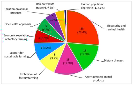 The process of the search for the core literature and its results are depicted in Figure 1. A query in Google Scholar yielded 138 hits from which seven duplicate entries were excluded. Two further commentaries that appeared as non-peer reviewed blog posts and another two potentially relevant studies that described results from before the onset of COVID-19 were not included. Another 92 records were ruled out due to the fact of their irrelevance, 31 of which because, even though dealing with zoonotic diseases, such as COVID-19 as a main topic, they either lacked responses, such as recommendations, policies, measures, behaviours, attitudes and beliefs, or were without reference to factory farming or both. The remainder of the excluded articles embraced topics outside the scope of the research questions. In total, 35 relevant publications were located as well as six additional articles from their bibliographies and, therefore, a total of 41 publications constituted the core literature of the present investigation. Subsequent scrutiny of the core articles for relevant content gave rise to the delimitation of 10 thematic categories as (potential) fields of policy action within which responses to COVID-19 with respect to the zoonotic risk of industrial animal farming were identified: (1) “biosecurity and animal health”, concerning measures of disease prevention on farms and surveillance of emergence and spread of infectious diseases (relevant content of 20 articles of the core literature); (2) “dietary changes”, related to dietary responses and recommendations aimed at the curbing consumption of animal products, specifically from factory farming (relevant content of 11 core literature articles), effects related to direct constraints of the crisis, e.g., change in dietary patterns due to the lockdowns were regarded as direct consequences rather than societal responses and, therefore, not considered; (3) “alternatives to animal products”, i.e., options to substitute animal products, most importantly conventional meat from factory farming by novel protein sources the production of which is associated with no or lower zoonotic risk (10 relevant articles); (4) “prohibition of factory farming” as well as closure of farms as a radical approach (seven articles); (5) “taxation on animal products”, i.e., levies to discourage consumption of meat and other animal-based products (five articles); (6) “economic regulation of factory farming”, including investments, divestments, and taxation on the production side (five articles); (7) “support for sustainable farming”, as an alternative to factory farming (five articles); (8) “One Health approach”, a holistic and global scope of action of essential importance for prevention of zoonotic diseases (five articles); (9) “ban on wildlife trade”, a response potentially inversely correlated with factory farming (four articles); (10) “human population degrowth”, i.e., controlling human reproduction resulting in a decline in population (one article). The most important categories as assessed by the number of included records were “biosecurity and animal health”, “dietary changes” and “alternatives to animal products”. Additional specific searches in each of the categories for records containing new information beyond the core literature afforded another eight relevant articles, of which three were identified in “alternatives to animal products”, two in “biosecurity and animal health”, and one each in “dietary changes”, “prohibition of factory farming” and “support for sustainable farming” (cf. Appendix A). The resulting numbers and proportions of articles with relevant content in each category are summarised in Figure 2, and a tabulation of all relevant contents is provided in Table A1 in Appendix B. In the following, identified responses are described in detail according to distinct societal actor groups that are involved in their (potential) implementation.