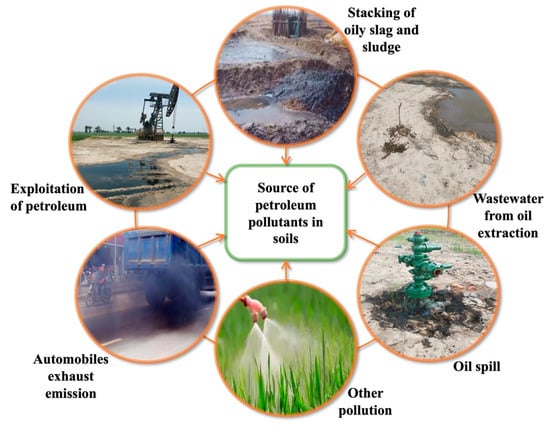 Extraction, processing, and transportation (pipe rupture) all contribute to the entry of petroleum into the soil environment [1,2]. The primary contaminants in petroleum-contaminated soil are toxic and hazardous aliphatic, cycloaliphatic, and aromatic hydrocarbons [3]. They decrease the diversity of plants and microbes in the soil, deplete soil fertility, disrupt soil ecological balance, and even put human health at risk [4]. Crop germination is delayed, the chlorophyll content is poor, and some crops perish when grown in high petroleum-contaminated soil [5]. Furthermore, pollutants can enter the human body by breathing, skin contact, or eating petroleum-contaminated food, causing contact dermatitis, visual and auditory hallucinations, and gastrointestinal disorders, as well as substantially raising the risk of leukemia in children. Although certain low-molecular-weight hydrocarbon pollutants will weather and decay over time, high-molecular-weight hydrocarbon pollutants will remain in the soil for a long period due to their hydrophobicity, causing secondary contamination in the ecosystem [6,7]. According to statistics, Chevron Texaco’s oilfields in Ecuador’s Amazon region have harmed human health, the water supply, and the ecosystems in the area. The plaintiff (30,000 individuals of mixed races and indigenous peoples) was awarded USD 9.5 billion by the Cuban Supreme Court in 2013 [8]. This demonstrates that petroleum pollutants have a negative influence on society in addition to destroying the environment. As a result, the issue of restoring petroleum-contaminated soil has become a hot topic.