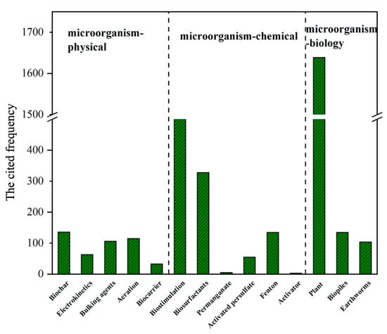 The time period is confined to 2016–2020 according to six databases in the “web of research.” “Microbial biochar (electrokinetics/bulking agents/aeration/biocarrier/biostimulation/biosurfactants/permanganate/activated persulfate/fenton/activator/plant/biopiles/earthworms) remediation of petroleum polluted soil,” according to the results of the particular search keywords. The limit for the search is 17 September 2020, and the findings will be examined statistically. From 2016 to 2020, the papers employing the three combined microbial approaches to treat petroleum-polluted soil had the highest citation frequency (Figure 4). The microorganism–biochar, microorganism–nutrients, and microorganism–plant combined microbiological techniques have been extensively used for hydrocarbon degradation in current study, according to the gathered data.