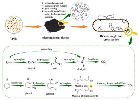 The basic interactions that occur in the microorganism–biochar remediation of pollutants are illustrated in Figure 5. The three modes of microorganism–biochar remediation include adsorption, biodegradation, and mineralization, or a combination of these three. Because of the huge specific surface area and rough surface structure of biochar, associated microorganisms produce biofilm, which improves the adsorption and degradation rate of hydrocarbons while also increasing the quantity of soil and active microorganisms. Simultaneously, studies have demonstrated that fixed bacteria may employ carbon chains more broadly than free bacteria, and the clearance rate of hydrocarbons has risen by around 21% to 49% [137].