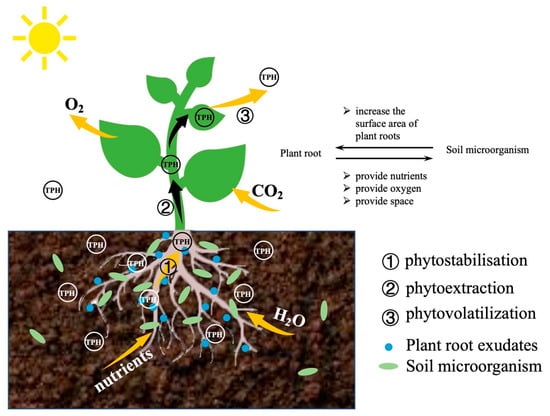 The mechanisms of microorganism–plant remediation can be classified as degradation, extraction, inhibition, or a combination of the three. Roots not only give oxygen to microorganisms in the rhizosphere through respiration, but they also stimulate the release of root exudates and the degradation of rhizosphere contaminants [153]. Plants and microorganisms then degrade hydrocarbons into simpler organic molecules by expressing specific enzymes such as nitroreductase, dehalogenase, laccase, and peroxidase, among others [154]. Some pollutants are adsorbed on the root surface and accumulate in the root via the hemicellulose of the plant cell wall and the lipid bilayer of the plasma membrane [155]. A part of the pollutants are absorbed via phytoextraction/plant transfer to the upper section of plants (stems and leaves) [156]. Finally, phytovolatilization releases certain contaminants into the atmosphere [157]. Some plants, as a self-protection strategy, limit the transfer of hydrocarbons from the roots to the ground, retaining more hydrocarbons in the root tissues. This limitation preserves the chlorophyll and other nutrient synthesis mechanisms of plants and ensures that photosynthesis continues to function normally [156]. This is to guarantee that photosynthetic processes of the plants are regular, allowing them to produce more energy for survival and repair.