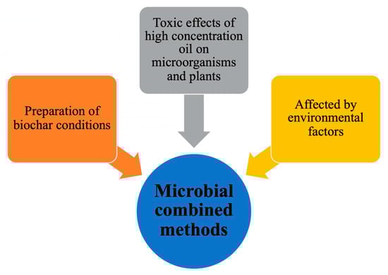 Most microorganisms and plants are more suitable to soil remediation with a petroleum pollution concentration of less than 5%, according to previous studies [26,151,166]. The remediation potential of microorganisms and plants is rapidly negatively affected when the concentration of petroleum pollutants in the soil increases (5%). The original oil content was 1.21%, and the removal rate of Testuca arundinacea for TPH was 64.0 ± 1.6% after 90 days of repair, and the removal rate of biological flora was 54.6 ± 1.3% [151]. After 90 days of repair, the stem and root biomass of ryegrass is lower than the control group when the soil oil concentration is 3% [167]. Tall fescue can remove 48.4% of oil pollution after 70 days of restoration when the soil oil concentration is 5% [168]. Microorganisms could remove 15% of petroleum pollutants after 70 days of remediation when the soil oil content is 5.6% [169]. When soil oil levels are too high, it is hazardous to plants and microorganisms, reducing their capacity to degrade petroleum contaminants and potentially causing deaths in microorganisms and plants. Extreme climatic circumstances (soil temperature below 10 °C, pH value below than 4 and higher than 9), on the other hand, will limit the activity of microorganisms and plants, lowering the removal of petroleum pollutants. Changes in soil pH and abiotic or biodegradation of biochar, on either hand, will increase the desorption of PAH from biochar into sediments. In conclusion, despite the benefits of minimal secondary contamination and low cost, microbial remediation still confronts significant challenges.