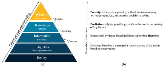 The data–information–knowledge–wisdom (DIKW) hierarchy is commonly used to describe the transition from raw data to organized information sets to data-driven insights [29]. We apply the DIKW hierarchy to provide context for understanding the decision support possible from big data technologies. Figure 2 shows the association between the levels of the DIKW hierarchy and the types of decision support (modified from [29,30]).