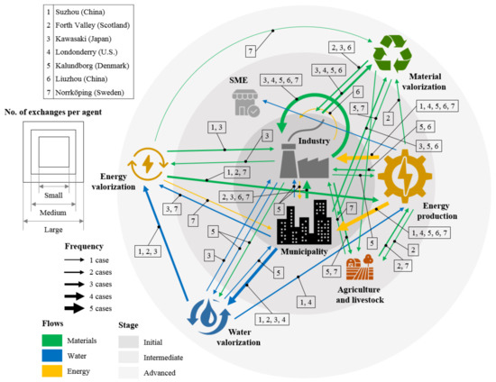 Figure 1 provides a graphical scheme of the agents identified in Table 2 and their relationships to each other, based on the case studies summarized in Table 1. These agents are represented using different sizes (small, medium, large) depending on the number of exchanges in which they participate, while highlighting the stage of development when they entered the system. Industry, energy production, and municipality agents are depicted as the largest in terms of exchanges, whereas SME, energy valorisation, and agriculture agents are the smallest. Material and water valorisation agents participated in a number of exchanges in between and therefore are represented by as being of medium-sized. The scheme also indicates the frequency with which each flow (materials, water, and energy) is exchanged, specifying its correspondence to the case studies under analysis (e.g., the energy production agent exchanges energy with industry and municipality in five case studies). The inspection of Figure 1 reveals that most of the interactions take place in the last stage. This is due to the ad hoc purpose of the material, energy, and water valorisation agents entering the system in this step since they are aimed at complementing the symbiotic network and increasing the number of relationships in order to reduce waste and close loops.