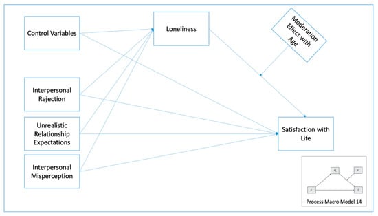 To test the hypothesis, multiple regression analyses were performed in Table 3. Some of the demographic variables, such as gender, age, marital status, education, and the number of siblings were used as control variables in all models. The direct effects were performed in all models. Firstly, in our conceptual model shown in Figure 1, an impact analysis was performed between the arguments, Interpersonal Rejection (IR), Unrealistic Relationship Expectations (URE) and Interpersonal Misperception (IM), and loneliness, which is the mediator variable, and model 1 was shown. Accordingly, IR positively, IM, and URE negatively had significant effects on loneliness (B = 0.362, B = −0.074, B = −0.038, p < 0.001, p < 0.001, p < 0.01, respectively). In Model 2, the effect of interpersonal rejection, interpersonal misperception, and unrealistic relationship expectations, independent variables, on satisfaction with life, which is the dependent variable, was analyzed. Accordingly, IR negatively and IM positively had significant effects on satisfaction with life (B = −0.291, B = 0.093, p < 0.001, p < 0.01, respectively). In Model 3, the effects of independent, mediator, and interaction (Ln X Age) variables on satisfaction with life were analyzed. Accordingly, it has been found that IR and interaction (Ln X Age) variables are significant (B = −0.085, B = 0.004, p < 0.05, p < 0.05, respectively).