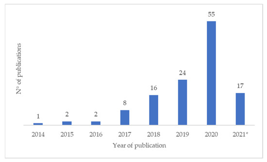 The first recorded study (in the WoS database) is by Mirabella et al. (2014), who focused on the possible use of food wastes of different origins (fruit, vegetable, dairy products, meat). Starting from 2017, the topic began to gain attention from the scientific community in a consistent way, and the trend continues to increase nowadays (+588% between 2017 and 2020). The scientific production could have been stimulated by the Circular Economy Action Plan, adopted by the European Union in December 2015. In particular, on 26 January 2017, the European Commission released a report on the implementation of the Plan with the aim to present a complete overview of the actions delivered in the implementation of the EU Action Plan since its adoption and to introduce key deliverables for 2017 [38].