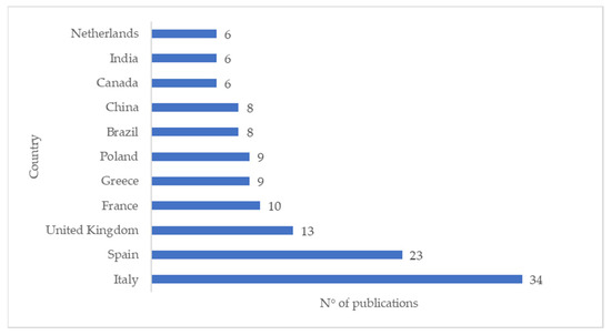 Figure 2 shows the countries with the higher number of publications; in particular, Italy is the most productive country (34 publications), followed by Spain (23) and the UK (13). China (as Brazil) has only eight documents. China developed a circular economy-based strategy in 2002, but the concept of the circular economy has gained a rising attention from governments and researchers since the Circular Economy Promotion Law of People’s Republic of China came into force in 2009 [39]. Europe approved the first Action Plan in 2015. While China promotes CE as a top-down national political approach, the EU implemented it as a tool to design bottom-up environmental and waste management policies [3]. Even if the approaches are different and the time span delayed, the EU is currently the leader contributor to the research on CE and agri-food.